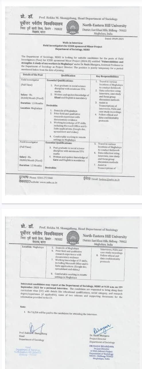 NEHU Shillong Recruitment 2025 – North-Eastern Hill University (NEHU), Shillong invites eligible candidates to attend a Walk-in Interview for the post of Field Investigator under the ICSSR sponsored Minor Project (2024–25) titled “Vulnerabilities and Strengths: A Study of Sex Workers in Meghalaya”. The interview will be held on 19th September 2025.