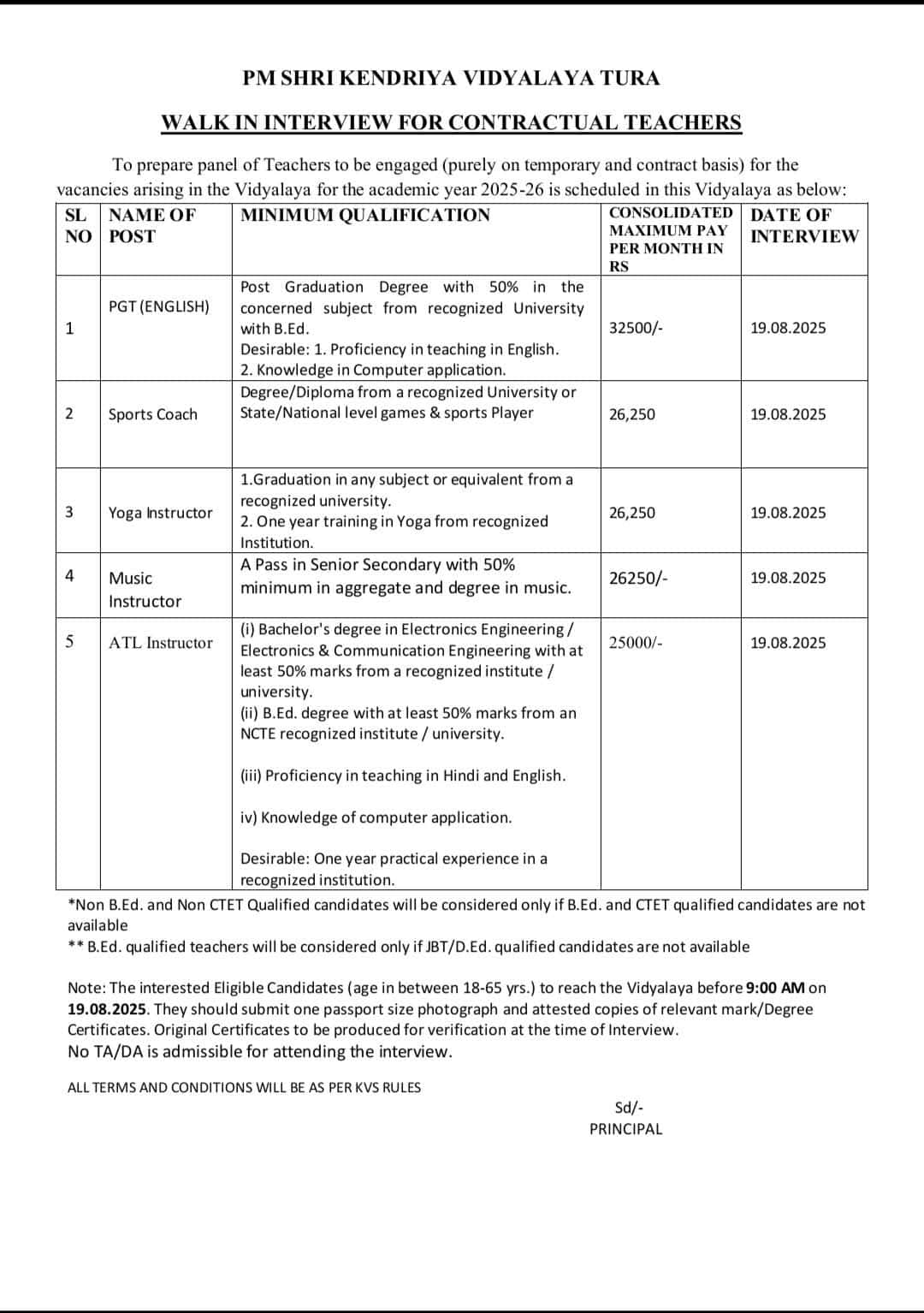 - Eligible candidates must appear for the walk-in interview at PM Shri Kendriya Vidyalaya Tura.